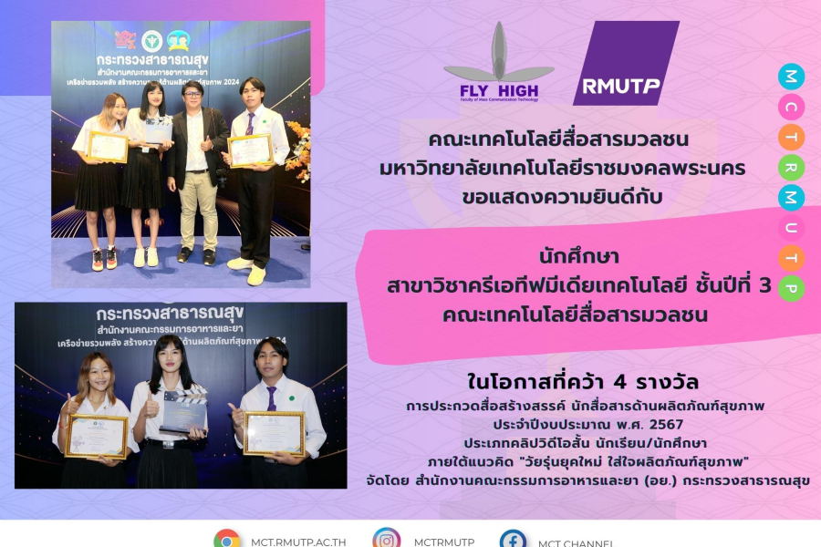 ขอแสดงความยินดีกับ นักศึกษาชั้นปีที่ 3 สาขาวิชาครีเอทีฟมีเดียเทคโนโลยี คว้า 4 รางวัล การประกวดสื่อสร้างสรรค์ นักสื่อสารด้านผลิตภัณฑ์สุขภาพ ประจำปีงบประมาณ พ.ศ. 2567
