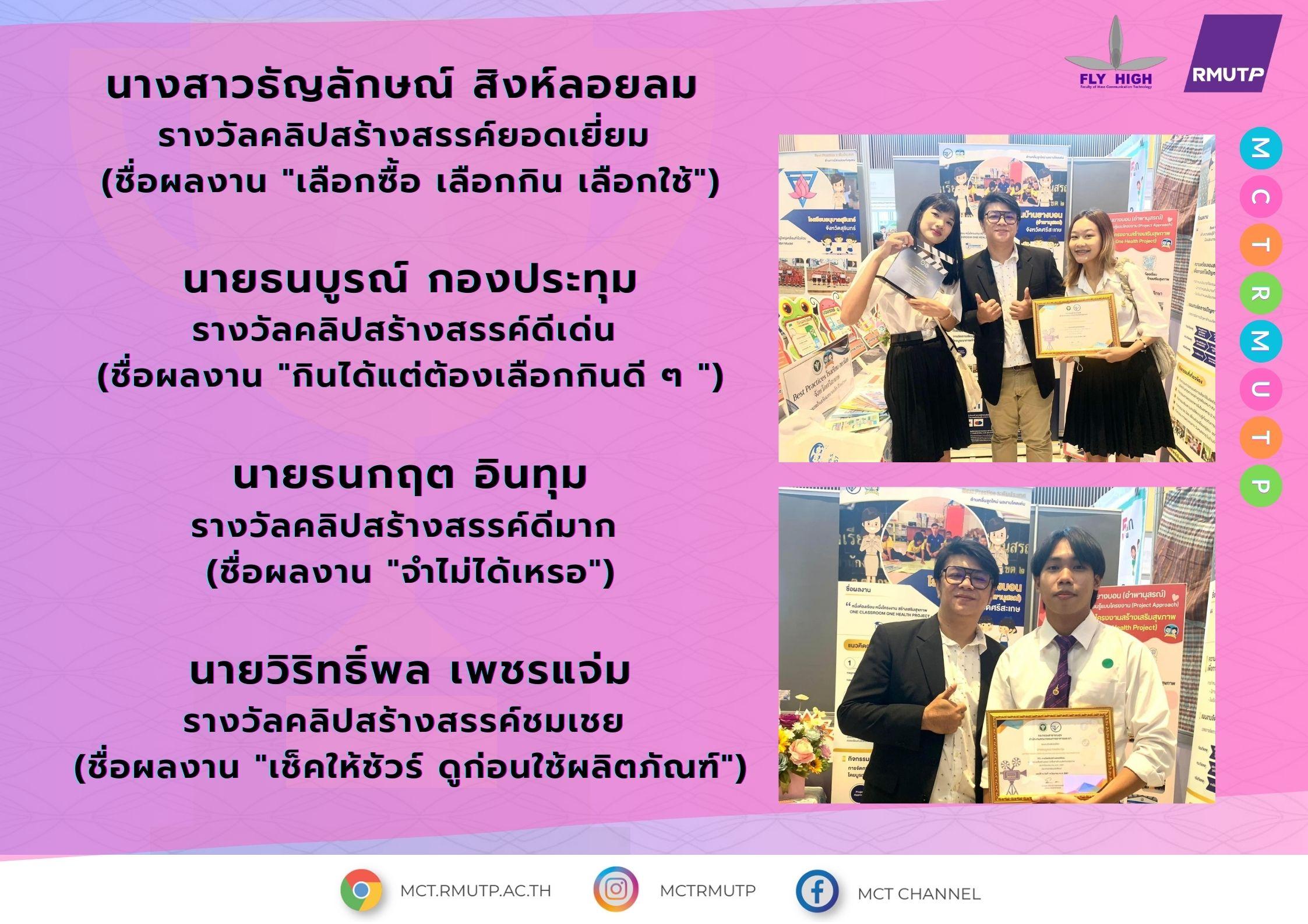สุดยอดไปเลย!!! Congratulations นักศึกษาชั้นปีที่ 3 สาขาวิชาครีเอทีฟมีเดียเทคโนโลยี คณะเทคโนโลยีสื่อสารมวลชน ราชมงคลพระนคร คว้า 4 รางวัล การประกวดสื่อสร้างสรรค์ นักสื่อสารด้านผลิตภัณฑ์สุขภาพ ประจำปีงบประมาณ พ.ศ. 2567 ประเภทคลิปวิดีโอสั้น นักเรียน/นักศึกษา ภายใต้แนวคิด “วัยรุ่นยุคใหม่ ใส่ใจผลิตภัณฑ์สุขภาพ” จัดโดย สำนักงานคณะกรรมการอาหารและยา (อย.) กระทรวงสาธารณสุข ประกอบด้วย นางสาวธัญลักษณ์ สิงห์ลอยลม รางวัลคลิปสร้างสรรค์ยอดเยี่ยม (ชื่อผลงาน “เลือกซื้อ เลือกกิน เลือกใช้”) นายธนบูรณ์ กองประทุม รางวัลคลิปสร้างสรรค์ดีเด่น (ชื่อผลงาน “กินได้แต่ต้องเลือกกินดี ๆ “) นายธนกฤต อินทุม รางวัลคลิปสร้างสรรค์ดีมาก (ชื่อผลงาน “จำไม่ได้เหรอ”) และนายวิริทธิ์พล เพชรแจ่ม รางวัลคลิปสร้างสรรค์ชมเชย (ชื่อผลงาน “เช็คให้ชัวร์ ดูก่อนใช้ผลิตภัณฑ์”) โดยมี อาจารย์ฮารีฟิน แวอาแซ อาจารย์พิเศษสาขาวิชาครีเอทีฟมีเดียเทคโนโลยี เป็นที่ปรึกษา