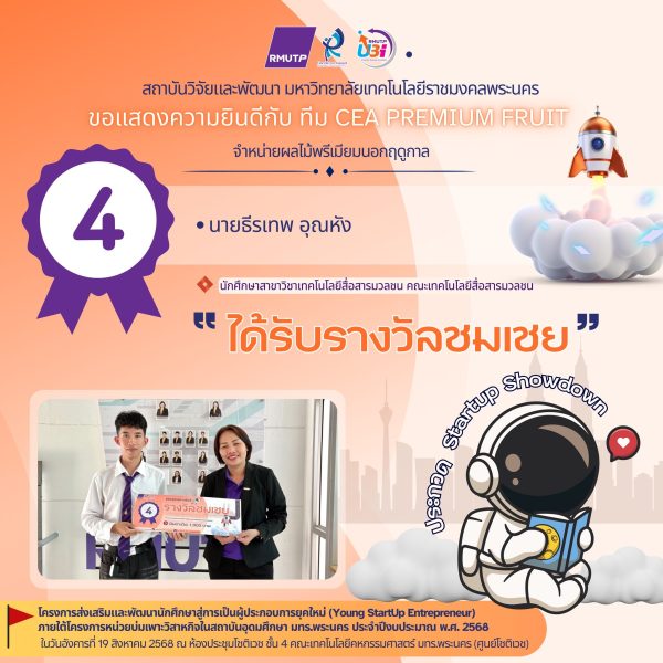 นายธีรเทพ อุณหัง นักศึกษาชั้นปีที่ 1 คณะเทคโนโลยีสื่อสารมวลชน คว้ารางวัลชมเชย หัวข้อ (จำหน่ายผลไม้พรีเมียมนอกฤดูกาล) จากการประกวด Startup Showdown สนามประลองไอเดียธุรกิจ ในงาน Young StartUp Entrepreneur ภายใต้โครงการหน่วยบ่มเพาะวิสาหกิจในสถาบันอุดมศึกษา ประจำปีงบประมาณ 2568 ซึ่งเป็นเวทีที่จุดประกายความคิดสร้างสรรค์ และพานักศึกษาก้าวสู่การเป็นผู้ประกอบการรุ่นใหม่! จัดขึ้น ณ ห้องประชุมโชติเวช ชั้น 4