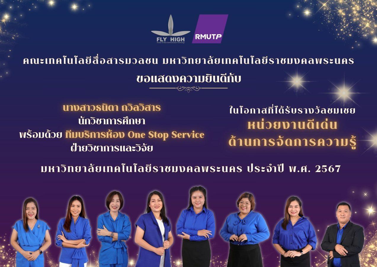 นางสาวธนิตา ถวิลวิสาร นักวิชาการศึกษา และทีมบริการห้อง One Stop Service ฝ่ายวิชาการและวิจัย ได้รับรางวัลชมเชย “หน่วยงานดีเด่นด้านการจัดการความรู้”