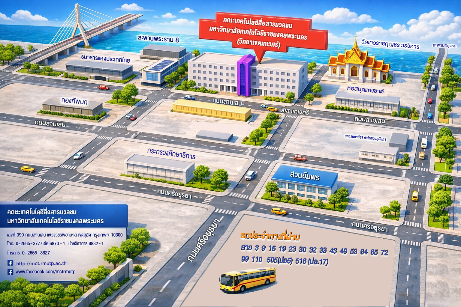 Contact Us คณะเทคโนโลยีสื่อสารมวลชน มหาวิทยาลัยเทคโนโลยีราชมงคลพระนคร: ที่อยุ่: เลขที่ 399 ถนนสามเสน แขวงวชิรพยาบาล เขตดุสิต กรุงเทพฯ 10300 เวลาทำการ: วันจันทร์ - วันศุกร์ เวลา. 7.30 น. - 14:30 น. ONE STOP SERVICE (วิชาการ งานทะเบียน การเงิน): โทร. 0-2665-3777 ต่อ 8223 ONE STOP SERVICE (กิจการนักศึกษา กยศ. วิชาทหาร): โทร. 0-2665-3777 ต่อ 8215 , 8218 , 8218 , 8219 , 6788 , 6820 งานสื่อสารองค์กร: ONE STOP SERVICE โทร. 0-2665-3777 ต่อ 6870 - 71 Email: pr.mctchannel@gmail.com Visit Us Address: เลขที่ 399 ถนนสามเสน แขวงวชิรพยาบาล เขตดุสิต กรุงเทพฯ 10300 © All Rights Mct