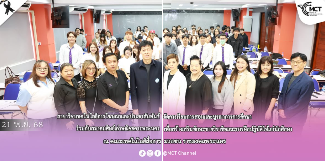 ในวันที่ 21 พฤศจิกายน 2568 สาขาวิชาเทคโนโลยีการโฆษณาและประชาสัมพันธ์ คณะเทคโนโลยีสื่อสารมวลชน มหาวิทยาลัยเทคโนโลยีราชมงคลพระนคร จัดการเรียนการสอนและบูรณาการการศึกษาร่วมกับสมาคมศิษย์เก่าพณิชยการพระนคร ได้รับเกียรติจากคุณสมศักดิ์ พรสุวรรณนภา นายกสมาคมศิษย์เก่าพณิชยการพระนคร คุณกฤช หาญประวีน ประธานโครงการศูนย์รสมธุรกิจศิษย์เก่า พพ. และคณะ