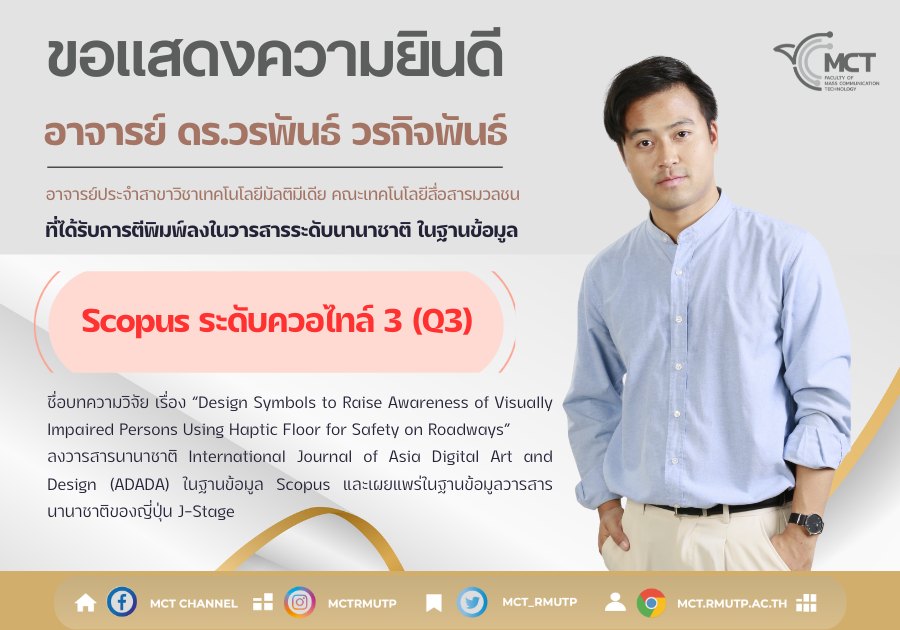 👉 ชื่อบทความวิจัย เรื่อง “Design Symbols to Raise Awareness of Visually Impaired Persons Using Haptic Floor for Safety on Roadways” ลงวารสารนานาชาติ International Journal of Asia Digital Art and Design (ADADA) ในฐานข้อมูล Scopus และเผยแพร่ในฐานข้อมูลวารสารนานาชาติของญี่ปุ่น J-Stage